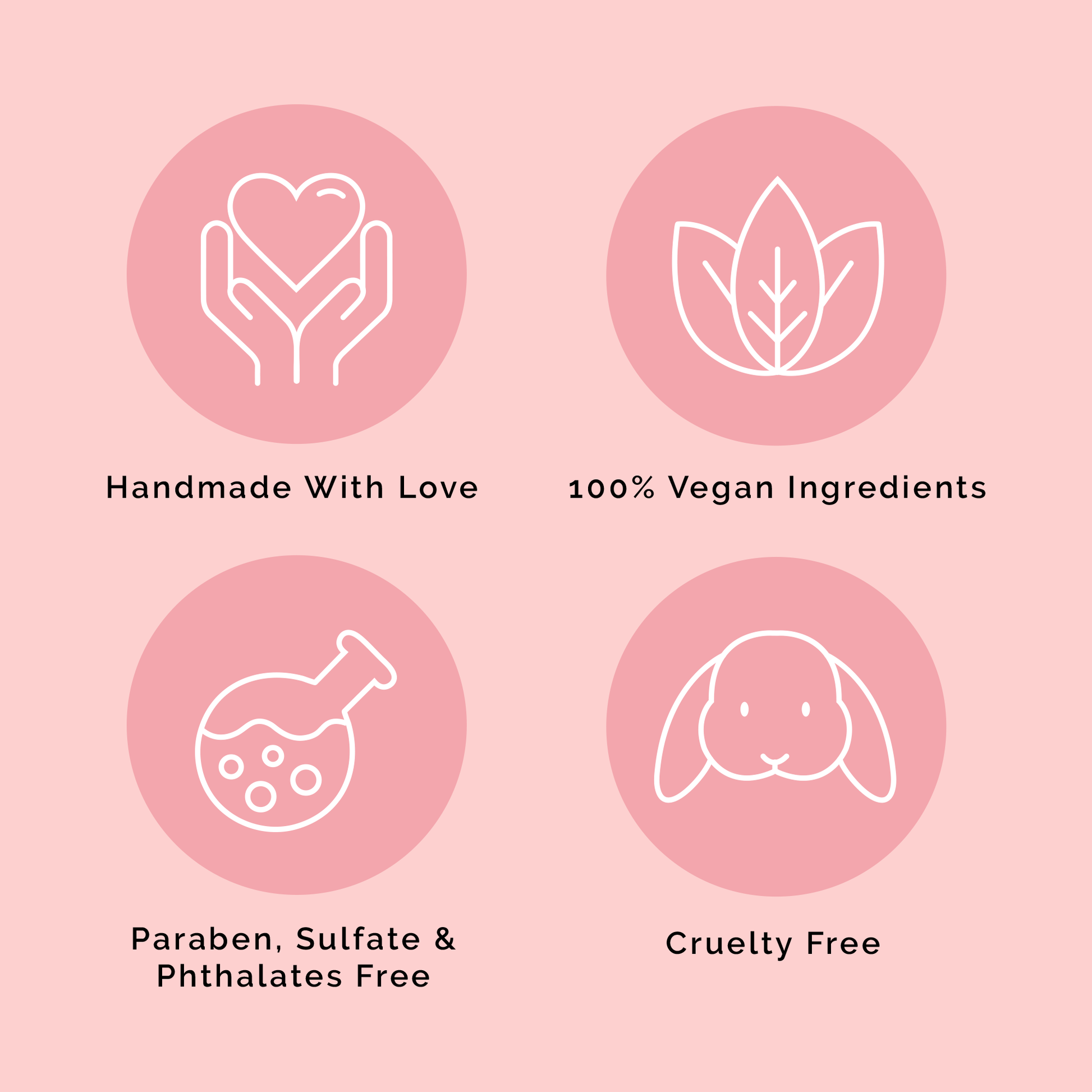 Calcium Bicarbonate, Citric Acid, SLSA, Cocoa Butter, Shea Butter, Glycerin, Strawberry Mochi Fragrance Oil, Red